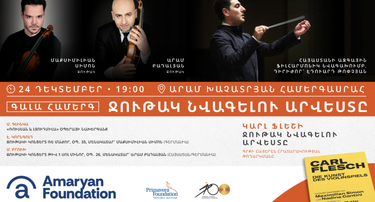 Այս կարևոր իրադարձությունը նշելու համար դեկտեմբերի 24-ին, «Արամ Խաչատրյան» համերգասրահում տեղի կունենա «Ջութակ նվագելու արվեստը» խորագրով համերգ։ Որպես մենակատարներ հանդես կգան գրքի գերմաներեն նոր հրատարության խմբագիրը և հայերեն հրատարակության թարգմանիչը` ջութակահարներ Մաքսիմիլիան Սիմոնը և Արման Բադալյանը։ Հայաստանի ազգային ֆիլհարմոնիկ նվագախումբը կղեկավարի Էդուարդ Թոփչյանը։ Ծրագրում կհնչեն Է.Վ. Կորնգոլդի և Մ. Բրուխ ջութակի կոնցերտները և Մ. Գլինկայի «Ռուսլան և Լյուդմիլա» օպերայի նախերգանքը: