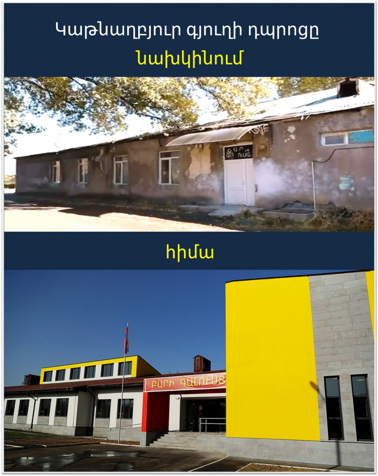 ՀՀ վարչապետի աշխատակազմի ղեկավարի տեղակալ Տարոն Չախոյանը սոցցանցի իր էջում հրապարակել է Կաթնաղբյուրի դպրոցի նախկին և ներկա լուսանկարներն ու գրել.
