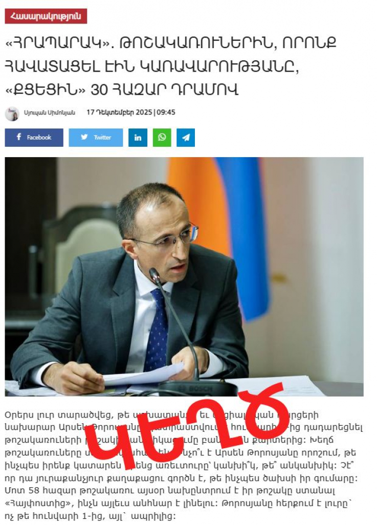 ԶԼՄ պնդումը, թե «թոշակառուներին քցեցին 30 000 դրամով» ակնհայտ կեղծիք է․ Կոստանյան