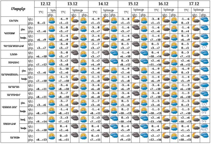 Հայաստանի տարածքում դեկտեմբերի 12-ի ցերեկը, 13-16-ն սպասվում է առանց տեղումների եղանակ: Գիշերը և առավոտյան ժամերին լեռնային և նախալեռնային գոտիներում ճանապարհները կպատվեն մերկասառույցով, Արարատյան դաշտում առավոտյան ժամերին հնարավոր է մառախուղ: դեկտեմբերի 17-ին, կեսօրից հետո առանձին շրջաններում սպասվում են տեղումներ: