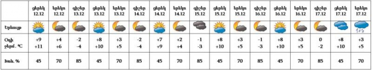 Երևան քաղաքում դեկտեմբերի 12-ի ցերեկը, 13-16-ն սպասվում է առանց տեղումների եղանակ: Առավոտյան ժամերին հնարավոր է մառախուղ: Դեկտեմբերի 17-ի ուշ երեկոյան սպասվում է անձրև: