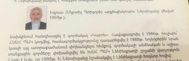 1986-ի հուլիսին Ներսիսյանը հավաքագրվեց ՊԱԿ-ի կողմից՝ «Կարոն» գործակալական ծածկանունով։ Նրա գործակալական գործունեությունը դադարեցվեց 1988-ի նոյեմբերին, երբ գործերը փոխանցվեցին Լենինգրադի վարչություն։ Եվ ահա, խորհրդային «հրաշքով», հենց այդ տարում նա նշանակվեց Լենինգրադի հոգևոր հովիվ։