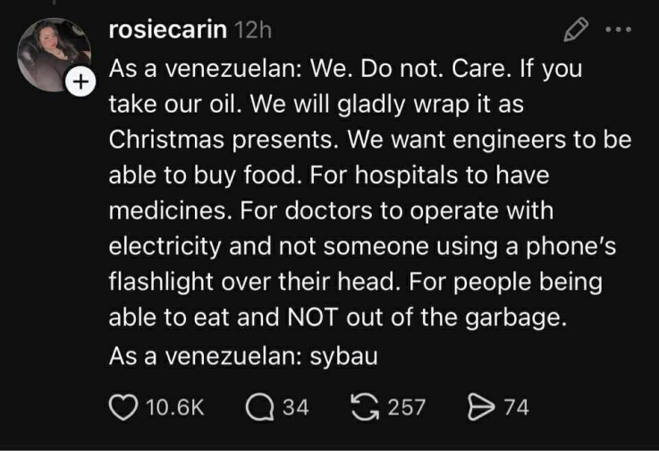 Որպես վենեսուելացի՝ մեզ չի հետաքրքրում։ Եթե դուք վերցնեք մեր նավթը, մենք այն սիրով կփաթեթավորենք որպես Սուրբ Ծննդյան նվերներ։