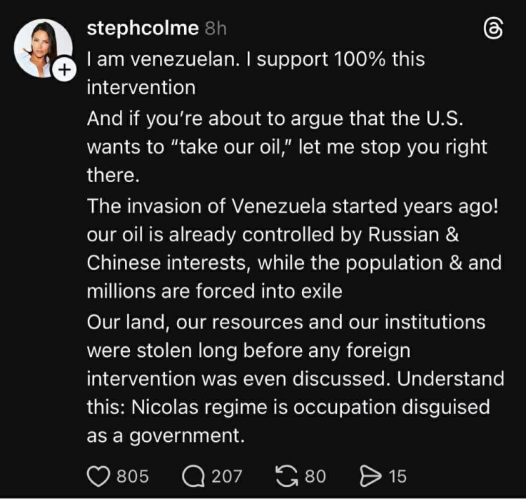Վենեսուելայի ներխուժումը սկսվել է տարիներ առաջ։ Մեր նավթն արդեն վերահսկվում է ռուսական և չինական շահերի կողմից, մինչդեռ բնակչությունը տառապում է, և միլիոնավոր մարդիկ հարկադրված են լքել երկիրը։