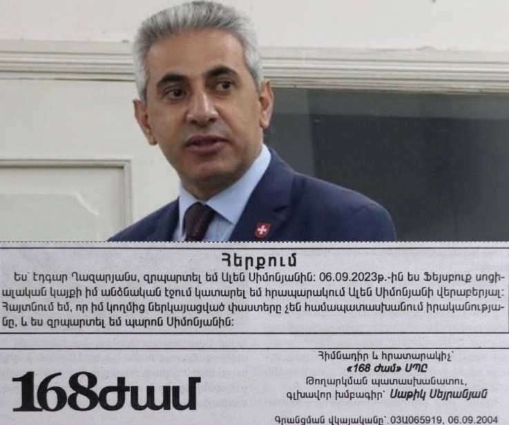 Ես՝ Էդգար Ղազարյանս, զրպարտել եմ Ալեն Սիմոնյանին. Ղազարյանը ներողություն է խնդրել