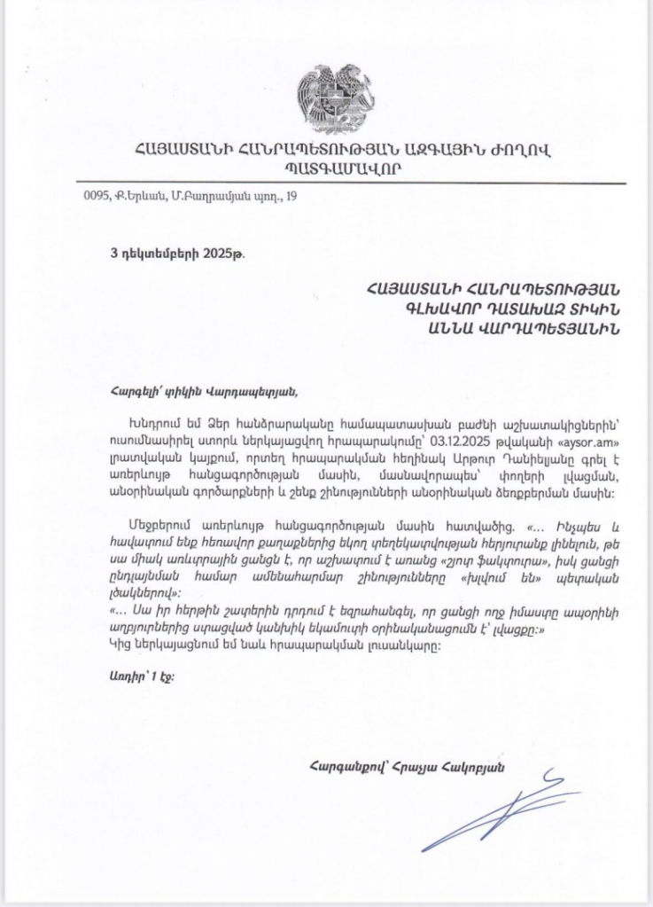 «Երեկ դիմում եմ ներկայացրել Գլխավոր դատախազություն՝ ուսումնասիրելու «aysor.am» լրատվական կայքում հրապարակված Արթուր Դանիելյանի գրառումը՝ առերևույթ հանցագործության մասին, մասնավորապես՝ փողերի լվացման, անօրինական գործարքների և շենք-շինությունների անօրինական ձեռքբերման վերաբերյալ»։