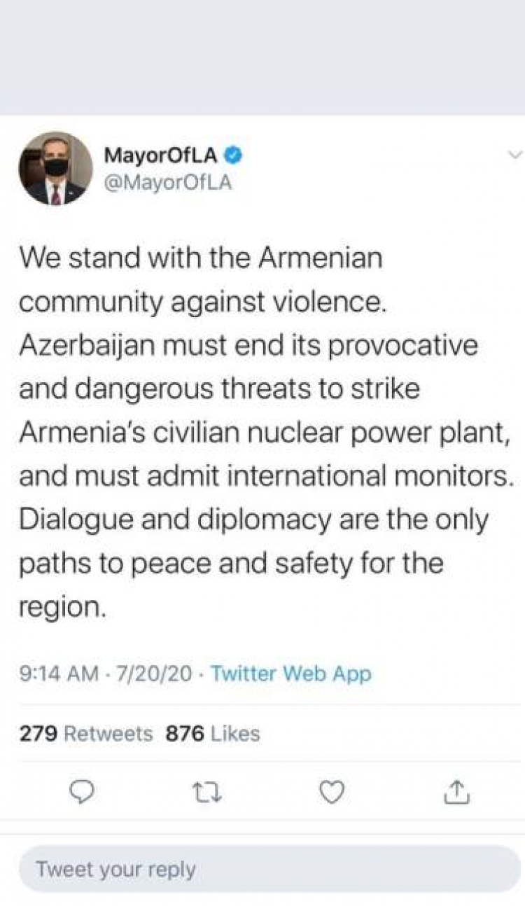 Կոչ ենք անում Ադրբեջանին դադարեցնել սադրիչ հայտարարությունները հայկական ատոմակայանի ռմբակոծման հետ կապված. Լոս Անջելեսի քաղաքապետի արձագանքը