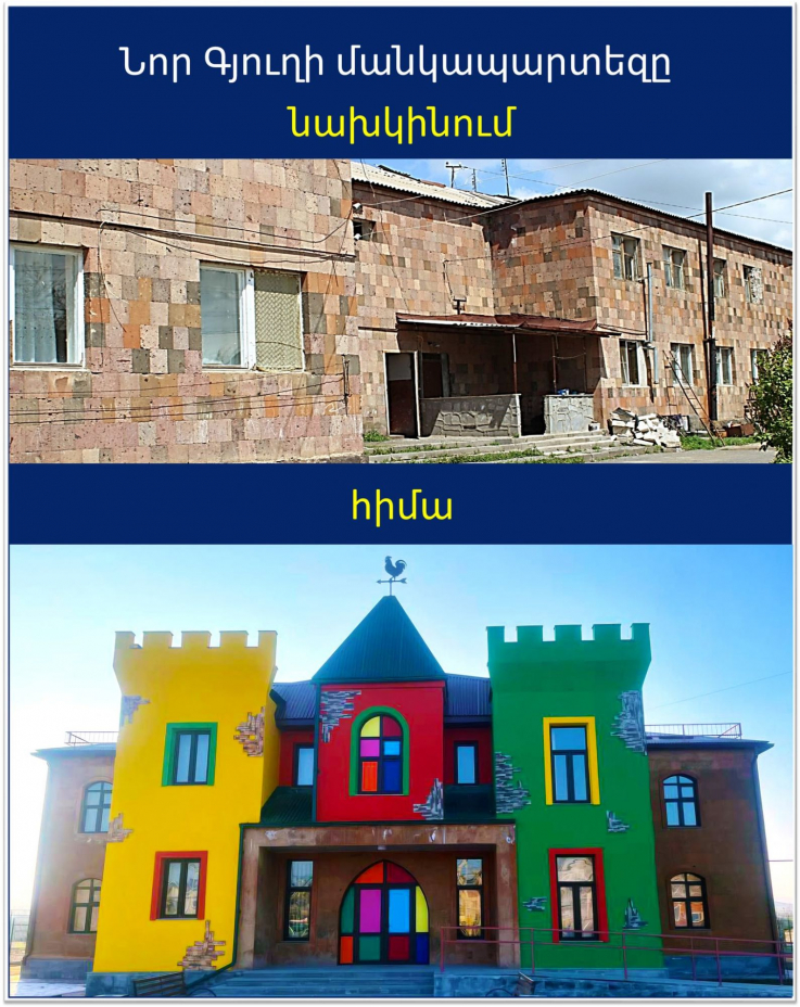 ՀՀ վարչապետի աշխատակազմի ղեկավարի տեղակալ Տարոն Չախոյանը «Ֆեյսբուք»-ի իր էջում հրապարակել է Նոր Գյուղ բնակավայրի մանկապարտեզի նախկին և ներկա լուսանկարներն ու գրել.
