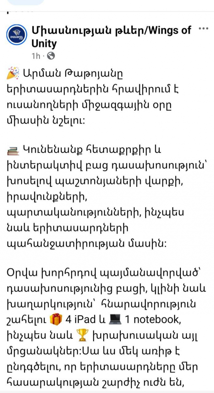 Արման Թաթոյանը, ով հայտնի է որպես Սերժի Թաթոյան, իր նորաստեղծ կուսակցության անունից հայտարարություն է տարածել։ Ըստ տարածված հայտարարության Արման Թաթոյանը հրավիրում է ուսանողներին հանդիպման։ Բայց քանի որ գիտեն՝ մարդ չի գալու, ստիպված 4 iPad և 1 notebook են խաղարկում։