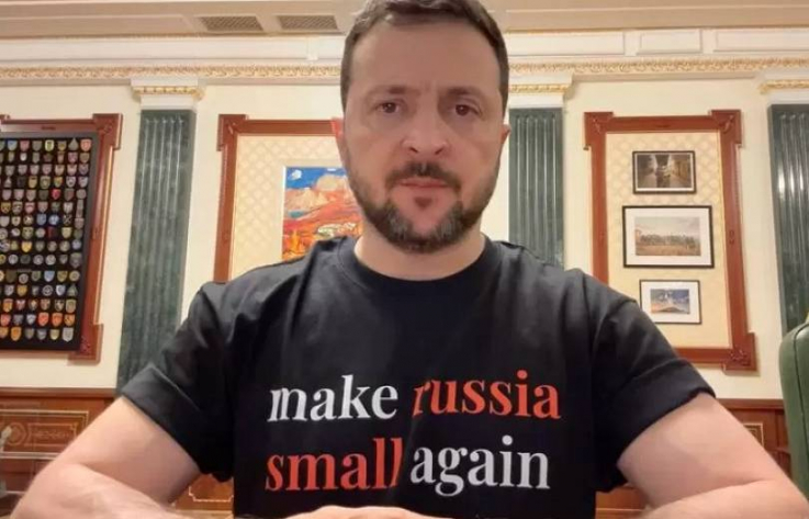 Ուկրաինայի նախագահ Վլադիմիր Զելենսկին իր վերջին տեսաուղերձի ժամանակ կրել է «Ռուսաստանը նորից փոքր դարձնենք» գրությամբ շապիկ: