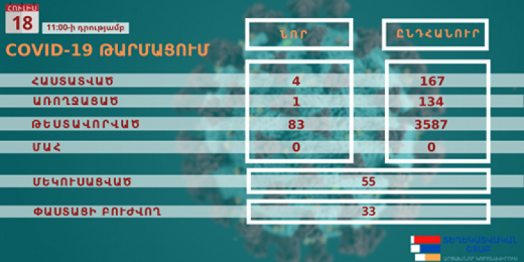 Ընդհանուր առմամբ, COVID-19-ը ախտորոշվել է 167 մարդու մոտ, որից 134-ը հաղթահարել է հիվանդությունը: Փաստացի բուժում է ստանում 33, ընդհանուր մեկուսացված է 55 քաղաքացի: