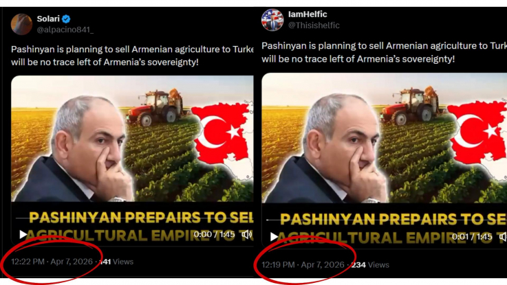 X-ի առնվազն 3 օգտահաշիվներում, որոնցից երկուսում գրեթե նույն ժամին, մյուսում՝ ավելի ուշ, տարածվել է մի տեսանյութ, որում, առանց կոնկրետ աղբյուրների պատշաճ հղում անելու, նշվում է՝ «Հայաստանի ֆերմերային ոլորտը մոնոպոլացվում է վարչապետ Նիկոլ Փաշինյանին փոխկապակցված անձանց առնչվող գյուղատնտեսական հոլդինգների կողմից: Վերլուծաբանները նախազգուշացնում են, որ սա կարող է հանգեցնել ռազմավարական գյուղատնտեսական ակտիվների վաճառքին թուրքական խոշոր կորպորացիաներին, ինչը սպառնում է երկրի պարենային անվտանգությանը և տնտեսական ինքնիշխանությանը»։